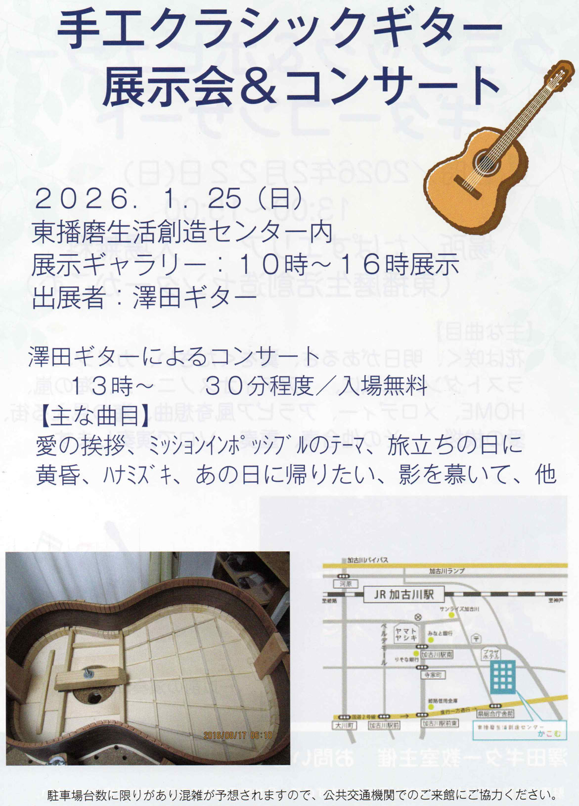クラシックギターの製作展示会とクラシックギターのコンサートを開催します。詳細はチラシをご覧ください。